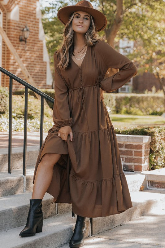 Solid Buttoned V-Neck Long Sleeve Tiered Maxi Dress