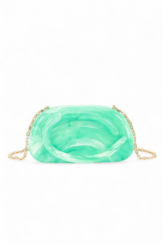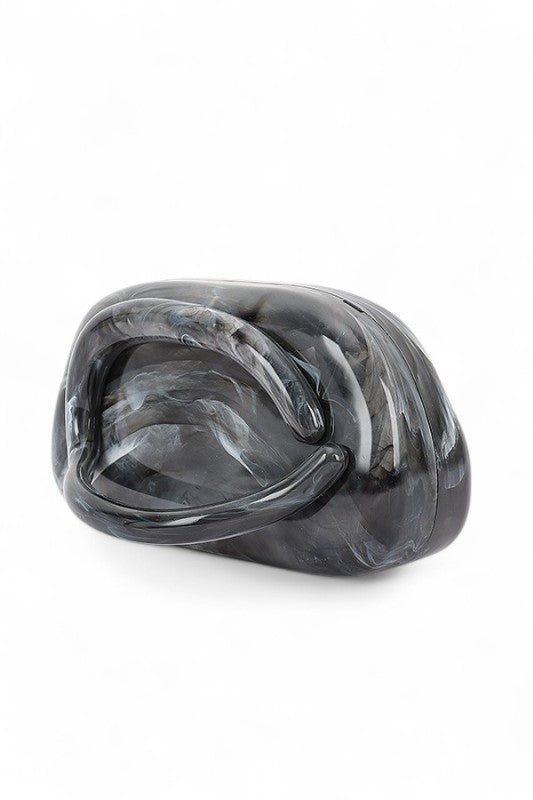 Crafted entirely from durable Acrylic, this clutch showcases a stunning marble resin finish that gives each piece a unique, luxurious tonal pattern. The structured, sleek box clutch silhouette is timeless, while the Iconic Handle detail adds a modern, distinct architectural flair. Perfectly sized at 8" Width 4" Height 3"Depth, it holds your evening essentials without compromising on high-fashion style. Carry this bag by its unique handle or tuck it under your arm for an instant infusion of chic luxury!