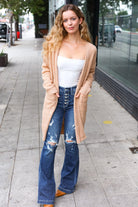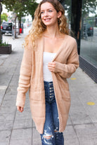 With cozy front pockets and mid-weight striped knit fabric, this midi length open cardigan will be your fav go-to layering piece this season.