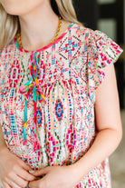 Flutter and frolic in our Boho and Behold Flutter Sleeve Dress! This lightweight wonder comes in a delicious blend of blush, fuchsia, and mint that'll make you pop like a summer popsicle. Playful flutter sleeves dance with every move, while the gathered tiers create a twirl-worthy silhouette. Tie the functional neck bow for extra cuteness, and—surprise!—it has pockets for all your tiny treasures! This no-stretch beauty is ready for adventures, picnics, and making everyone ask, "Where'd you get that dress?!"