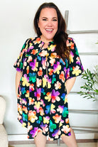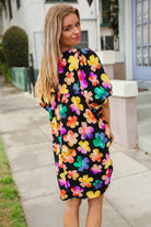 Look adorable in this vibrant floral print woven babydoll dress featuring a trendy notched ribbon bow tie, side pockets and stunning folded bubble elbow-length sleeves.