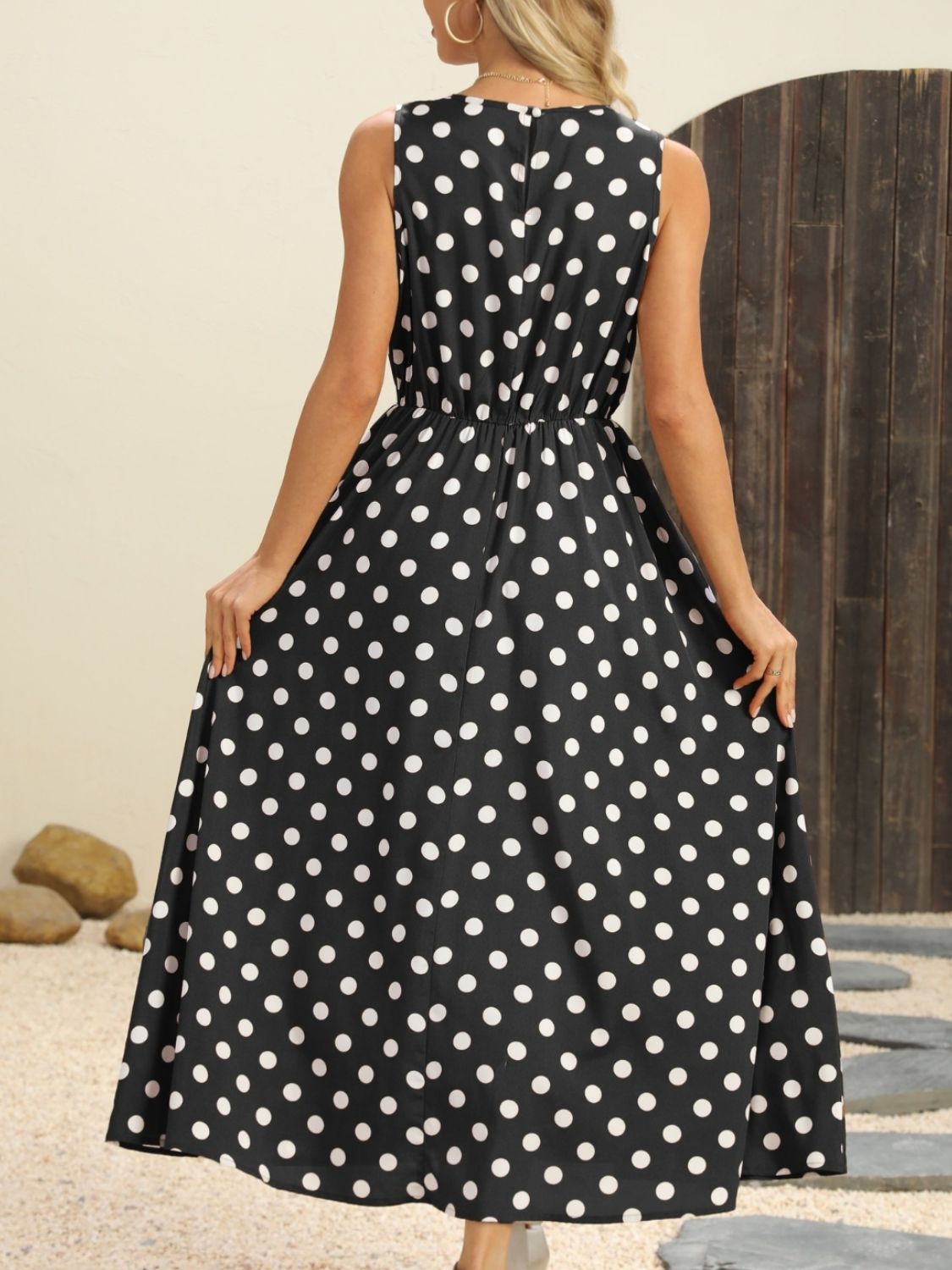 Polka Dot Round Neck Sleeveless Midi Dress