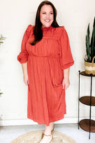 Turn heads with this mock neck, elastic yoke and fully lined ruffle detail midi dress. Made with a soft woven material and a unique embossed design, this stunner features back buttons and side pockets.
