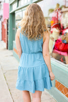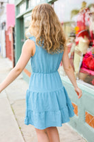 An elastic waist with a beautiful aquamarine color define this woven sleeveless dress. With a surplice ruffle yoke to display your fav accessories, turn heads with this stunning dress.