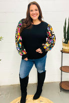 Diva Dreams Black Floral Sequin Mesh Sleeve Rib Knit Top