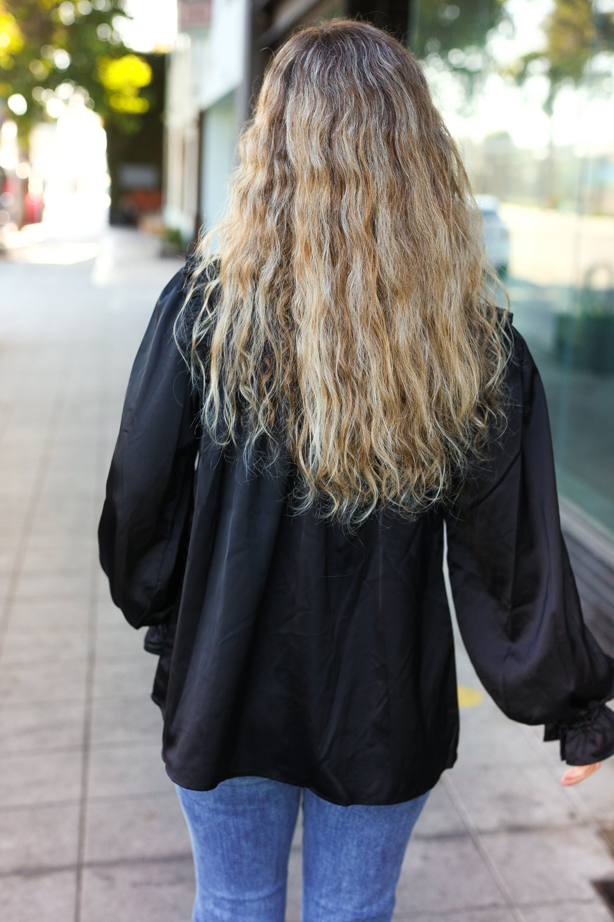 Be Your Best Black Satin Shirred Yoke Frilled Mock Neck Top
