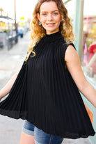 Donning a smocked mock neck, this elegant sleeveless woven pleated accordion top is perfect for work or play!