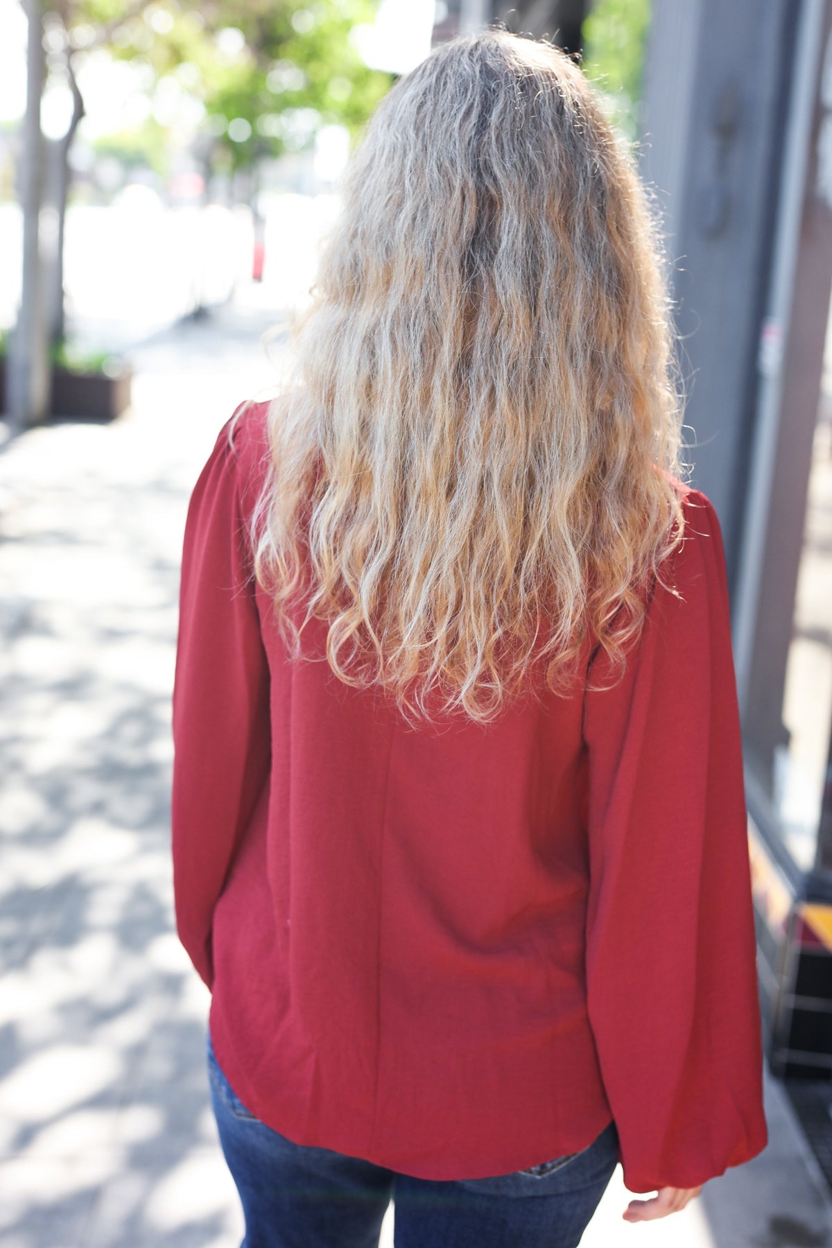 Add feminine flare to your fall closet with this gorgeous crinkle woven blouse with long bubble sleeves. A frill edge V neck and a tie neck complete a sublime look!