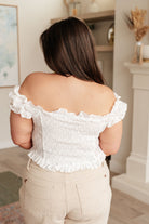 Rock a romantic and playful look with our In Fair Verona Button Up Crop. This off-white top features eyelet detailing, a charming ruffled neckline, and elastic sleeves for added comfort. The smocked elastic bodice back and functional front button closures provide the perfect fit, while the scalloped hem adds a touch of sweetness. Perfectly cropped for a trendy and flirty style.