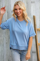 This short sleeve loose fit knit pullover features cap short sleeves and a hi-lo hem design. Super soft with stunning outseam reverse stitching, this will soon be your fall go-to staple! Wear with all your denim.