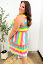 Look more than adorable in this multi-color rainbow stripe babydoll tiered dress with charming shoulder ties and side pockets. The soft french terry knit finishes off this dress. Perfect for all your summer outings.