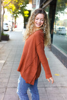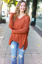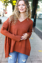 Casual Chic Rust Oversized V Neck Rib Knit Sweater