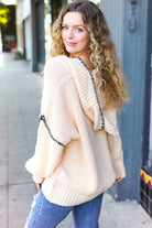 Prepare for cooler weather with this trendy and comfy oversized fit knit hoodie featuring a contrasting stitch detail and notched neck. Simply stunning!