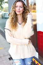 The Perfect Day Oatmeal Notched Neck Contrast Stitch Knit Hoodie