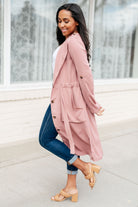 Fall in love with the First Day Of Spring Jacket In Dusty Mauve! Not only is the color absolute perfection, but the details are as well! Featuring a draped collar neckline, fully functional buttons, a cute waist tie, deep pockets, side slits, and roll tab sleeves. This lightweight jacket will pair well with all your spring essentials.