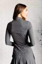 Get active in our Staying Swift Activewear Jacket in Titanium. Made with brushed microfiber, this form-fitting jacket features a mock neckline, functional full front zipper, thumb holes, long sleeves, and a back vent for added airflow. Plus, keep your essentials safe with functional zipper pockets. Perfect for the girl on-the-go!