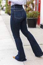 Be ready to catch glances with these high rise dark wash denim jeans with a flare design and raw hem. Functional front and back pockets complete these flattering flare jeans with plenty of stretch.