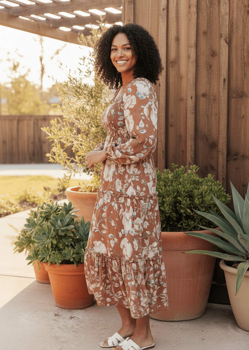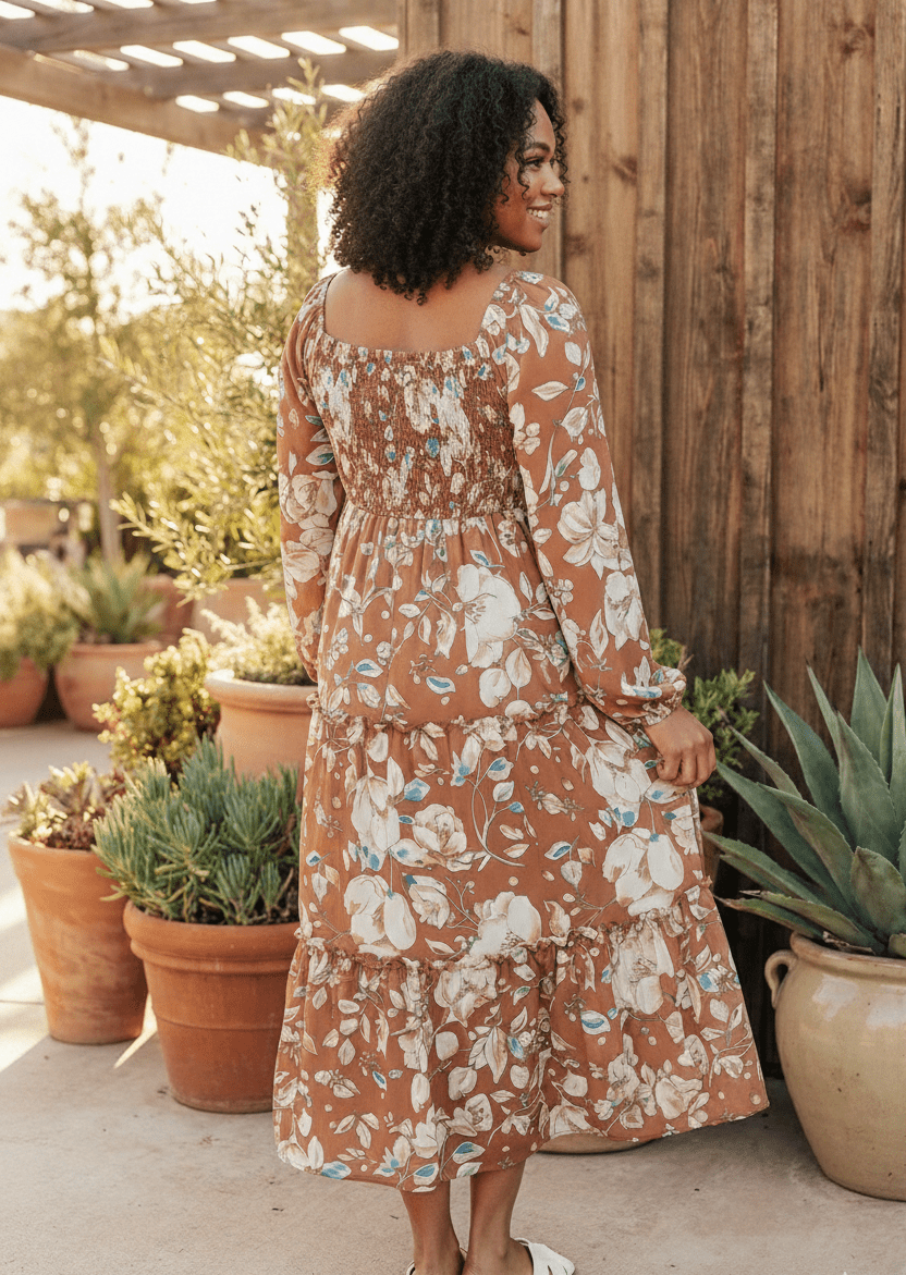 Radiate elegance in this stunning floral smocked maxi dress, featuring a flattering square neck and tiered silhouette. Designed for effortless style, the high-waist fit and stretchy cuffs ensure all-day comfort for any special occasion. Turn heads in a feminine masterpiece that blends boho charm with a perfect, snug fit.