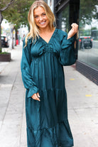 Elegant Hunter Green Elastic V Neck Tiered Satin Maxi Dress