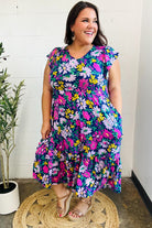 Keep your look breezy and feminine with this floral print ruffle sleeve dress featuring side pockets and a V neck. A fit and flare design completes this midi length dress.