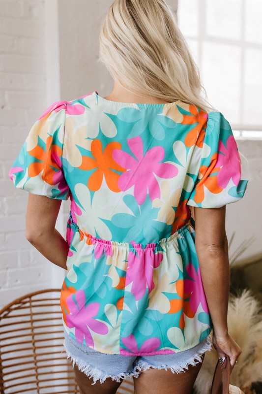 Kathryn Floral V-Neck Bubble Sleeve Peplum Blouse