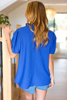 Lovely In Holiday Blue Frill Mock Neck Woven Top