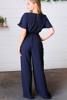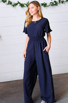 Dark Blue Smocked Waist Notch Neck Crepe Jumpsuit