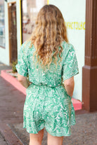 Highlight your romantic side with this sage green and cream bohemian print woven surplice flared shorts romper. With a back neck button, a beautiful drape and side pockets, get ready to look stunning.