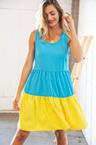 Enjoy warm summer nights with this stunning blue and yellow color block tiered woven dress with side pockets. With crepe-like fabric and a flared hemline, pair with sandals, flats or heels for a striking look.