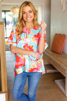 Weekend Ready Aqua & Coral Floral V Neck Woven Top