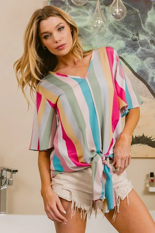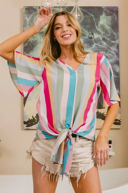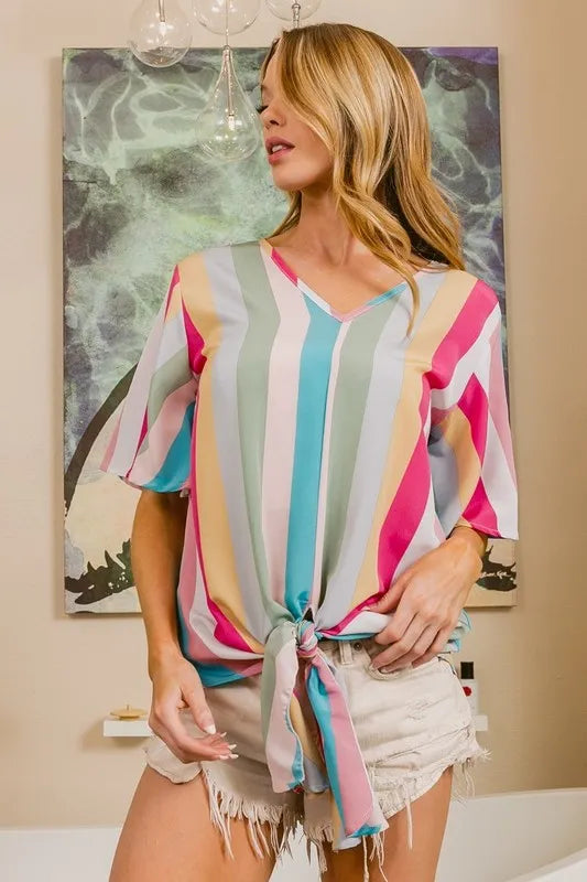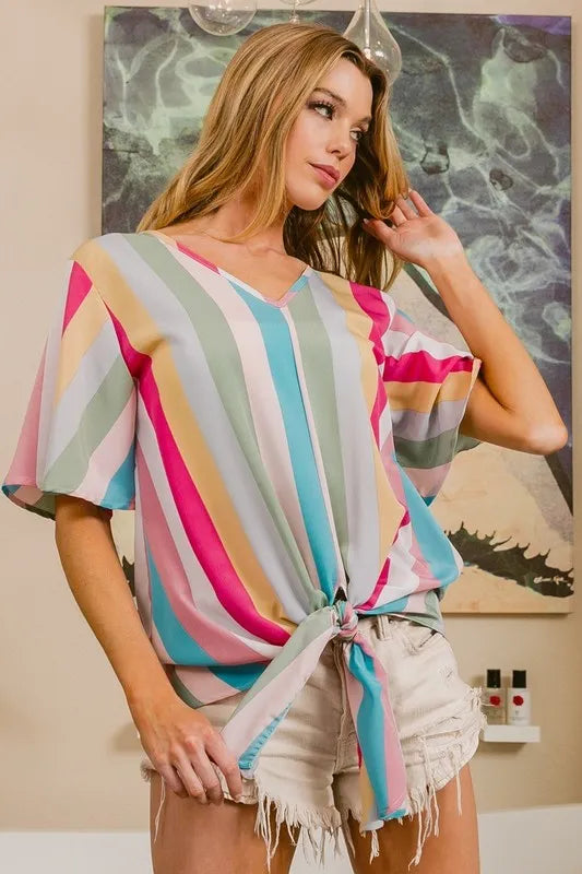 BiBi Multi Stripe Woven V Neck Top with Long Front Tie