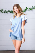 Bring on sun, sandals and all-things-feminine with this soft terry front tie raglan designed top featuring woven floral  and stripe double ruffle flutter sleeves finished with contrasting merrow stitching. Step out into Spring with flowy, confident style!