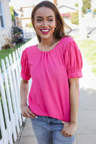 Perfectly You Solid Fuchsia Silk Shirred Cap Short Sleeve Blouse