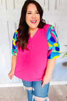 Tell Your Story Fuchsia Geo Print Puff Sleeve V Neck Top