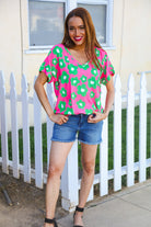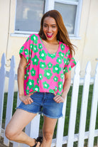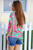 Spring Vibes Pink & Green Flower Print V Neck Short Sleeve Top