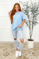 Unwind in the Layback Relaxed Basic Tee. Made from lightweight jersey knit, this tee features a banded round neckline and slouchy front patch pocket for a laid-back look. With exposed seam details, banded sleeve cuffs, and an oversized fit, it's perfect for lounging in style.