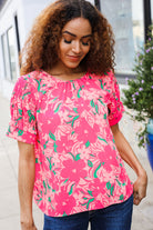 Vacay Vibes Floral Back Keyhole Short Smocked Banded Sleeve Top