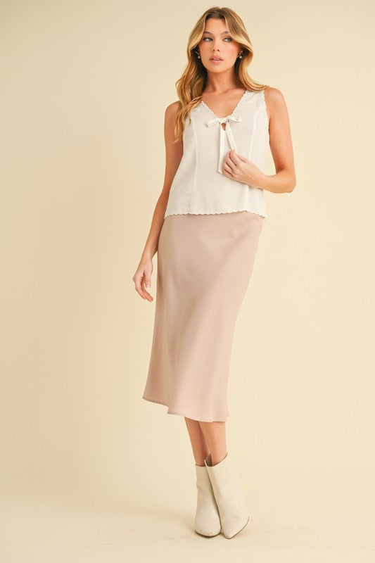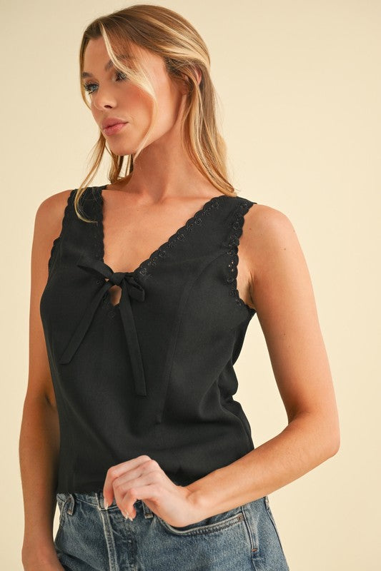 Sweet and simple, this lightweight Karis tank top is accented with intricate eyelet trim and a dainty front tie. Layer it with denim cutoffs for a beachy vibe or style it with flowy skirts for a whimsical touch.