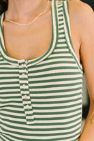 Laid-back with a little edge, this Snaccident Waiting to Happen Scooped Neck Tank in Green is made for everyday cool. Designed with a stretchy feel and a flattering scooped neckline, it features half-button closures, banded cuffs, and raw exposed seam details for that perfectly undone look. The faux back tag adds a touch of character, while the scooped hemline gives it an easy, throw-on-and-go vibe.