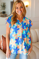 Tropical Breeze Turquoise Floral Banded V Neck Flutter Sleeve Top
