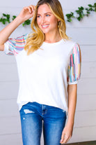 Ivory Multicolor Vertical Stripe Puff Sleeve Top
