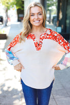 Feeling Femme Oatmeal Plaid Floral Color Block Notch Neck Top