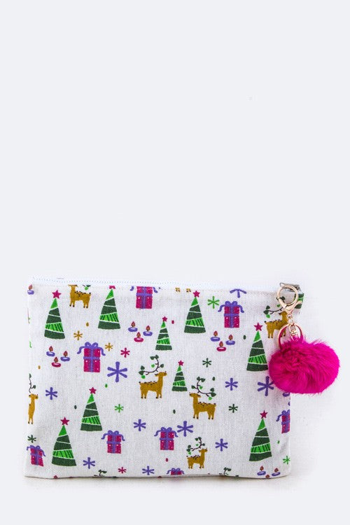 Xmas Print PomPom Canvas Pouch