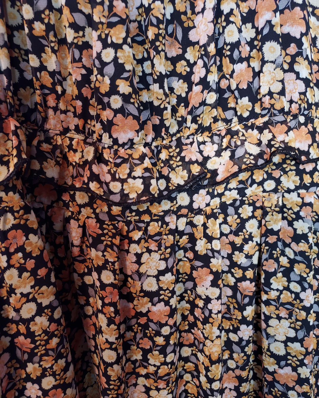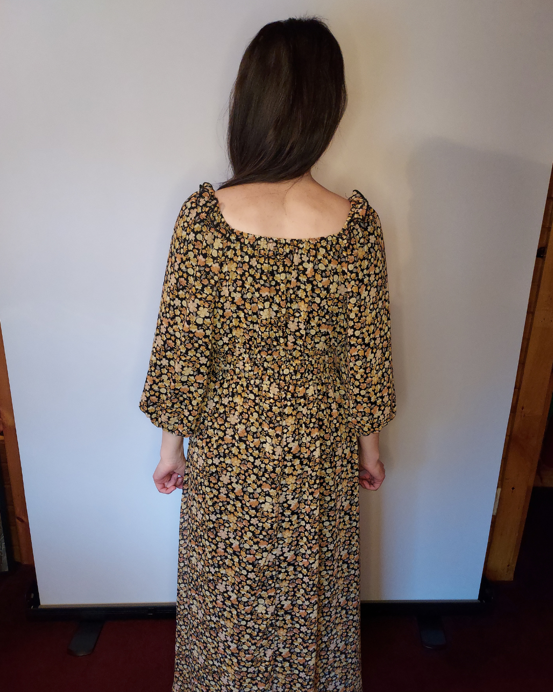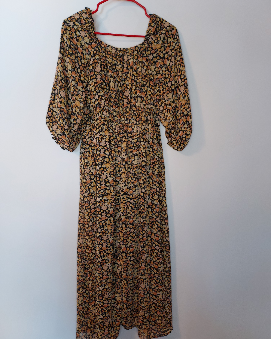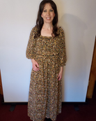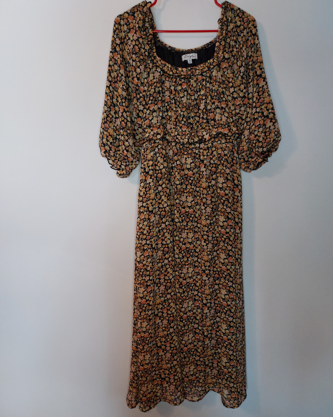 Step into a world of charm with the Ever So Briefly Floral Maxi Dress. This stunning piece, crafted from delicate poly chiffon, features an enchanting ditsy floral print that’s perfect for any occasion. Designed with a flattering square neckline, romantic 3/4 length sheer sleeves, and subtle ruffle details, this dress is sure to turn heads. The cased elastic waistband provides a comfortable, defined silhouette, while the full lining and convenient pockets ensure both style and functionality. It's the perfect blend of elegance and ease, making you look and feel your best.